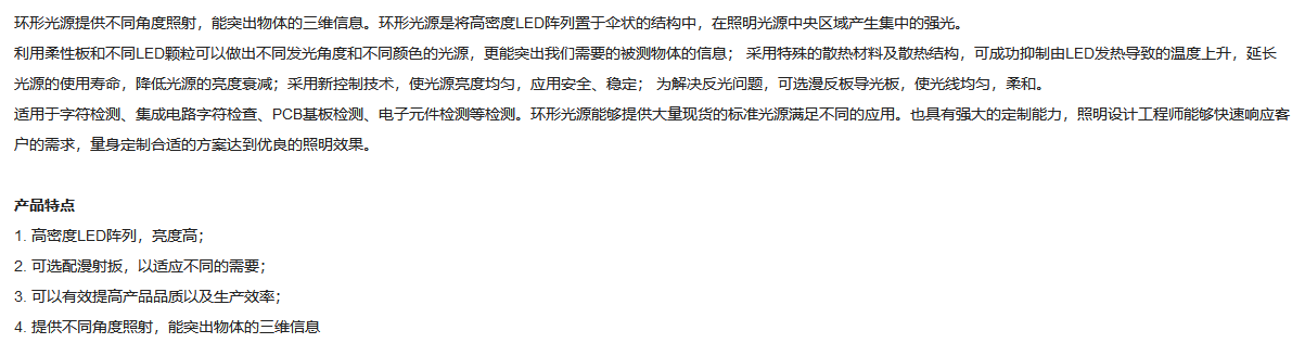 工作距离60-180mm 45°角照射 绿色环形光源
