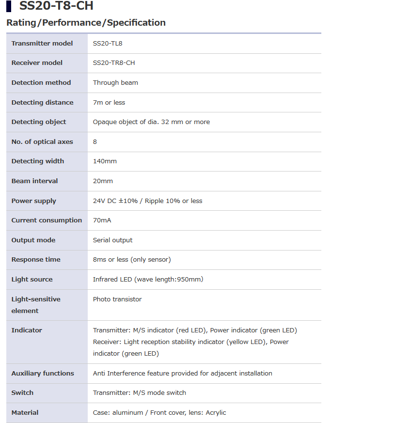 TAKEX竹中 SS20-T8-CH SS-CH Series 独立光轴输出光幕传感器 电话:0755-84670052 0755-83317701 手机/微信:13682357549 13246646513 QQ:672776553 564600083 1903656788 Email:672776553@qq.com 564600083@qq.com