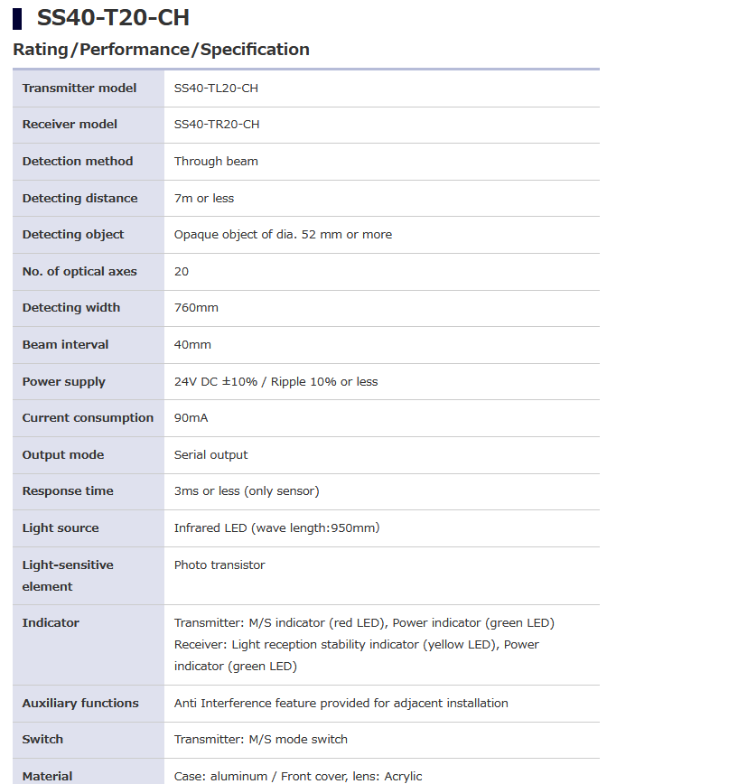 TAKEX竹中 SS40-T20-CH SS-CH Series 独立光轴输出光幕传感器 电话:0755-84670052 0755-83317701 手机/微信:13682357549 13246646513 QQ:672776553 564600083 1903656788 Email:672776553@qq.com 564600083@qq.com