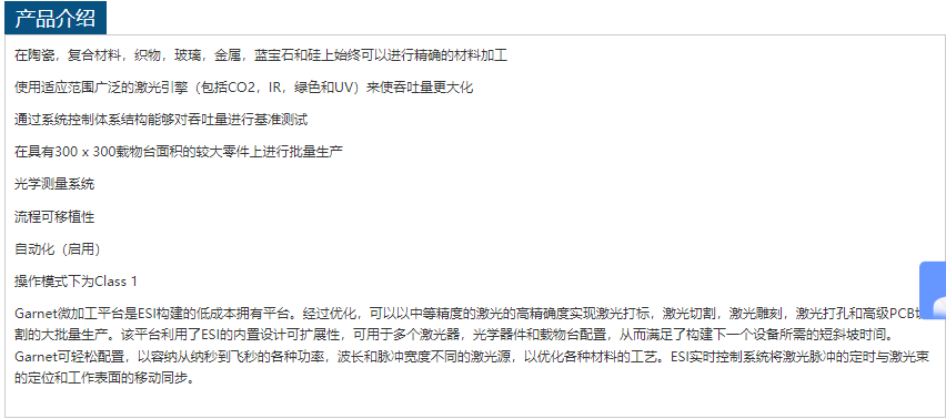 ESI激光加工平台Garnet 电话:0755-84670052 0755-83317701 手机/微信:13682357549 13246646513 QQ:672776553 564600083 1903656788 Email:672776553@qq.com 564600083@qq.com