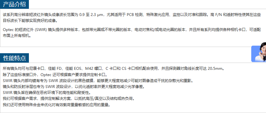 optec红外镜头OB-SWIR16 1.7 电话:0755-84670052 0755-83317701 手机/微信:13682357549 13246646513 QQ:672776553 564600083 1903656788 Email:672776553@qq.com 564600083@qq.com