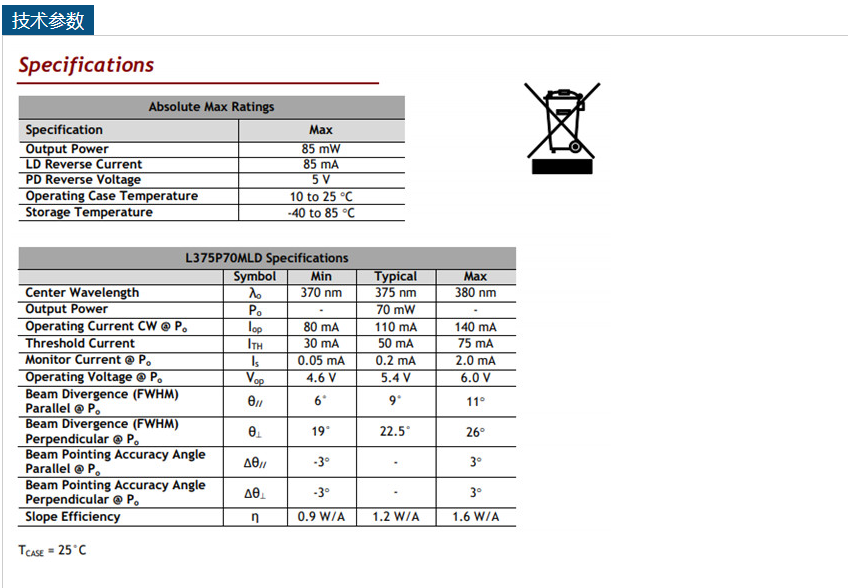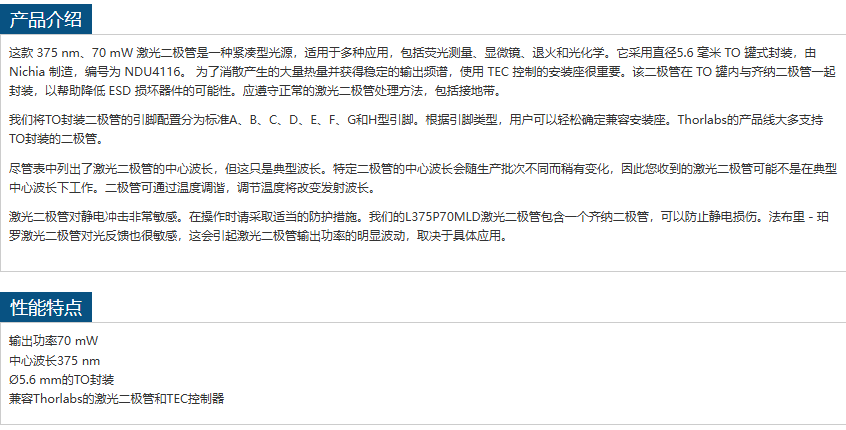THORLABS紫外激光二极管L375P70MLD 电话:0755-84670052 0755-83317701 手机/微信:13682357549 13246646513 QQ:672776553 564600083 1903656788 Email:672776553@qq.com 564600083@qq.com