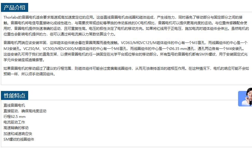 THORLABS音圈电机VC250 M 电话:0755-84670052 0755-83317701 手机/微信:13682357549 13246646513 QQ:672776553 564600083 1903656788 Email:672776553@qq.com 564600083@qq.com