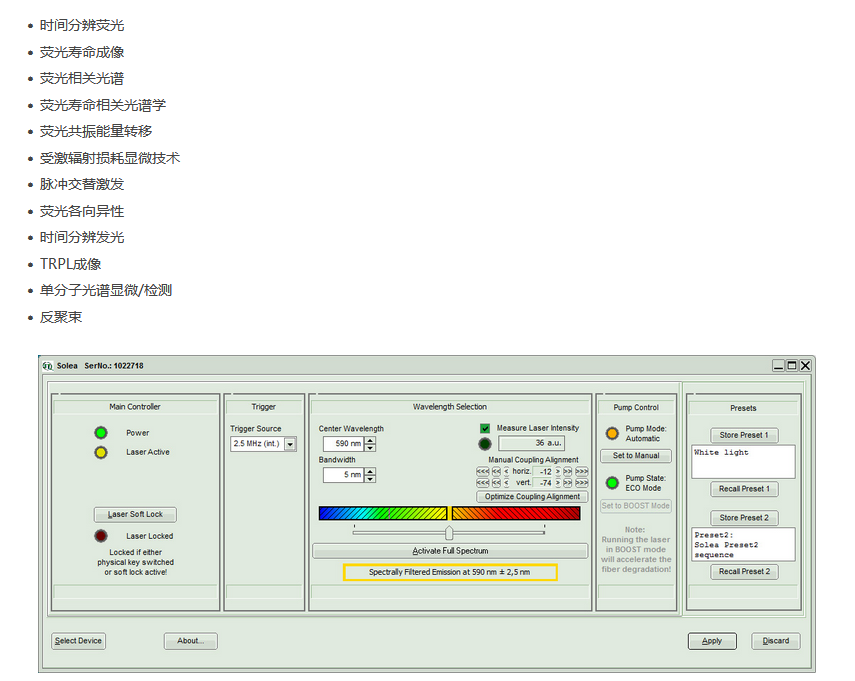 etsc东隆科技 超连续谱光源Solea 电话:0755-84670052 0755-83317701 手机/微信:13682357549 13246646513 QQ:672776553 564600083 1903656788 Email:672776553@qq.com 564600083@qq.com