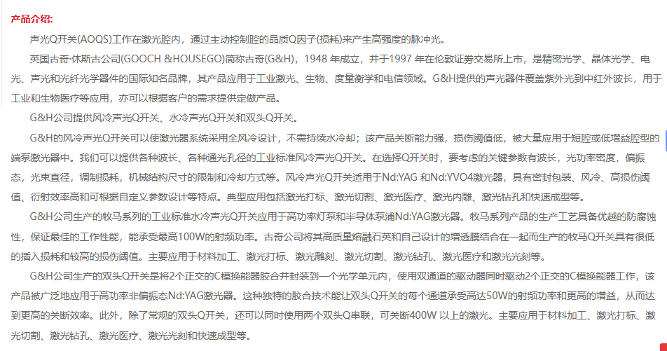 AnteLaser安特 GOOCH & HOUSEGO 声光Q开关(AOQS) I-QS080-1C10G-8-GH28 电话:0755-84670052 0755-83317701 手机/微信:13682357549 13246646513 QQ:672776553 564600083 1903656788 Email:672776553@qq.com 564600083@qq.com