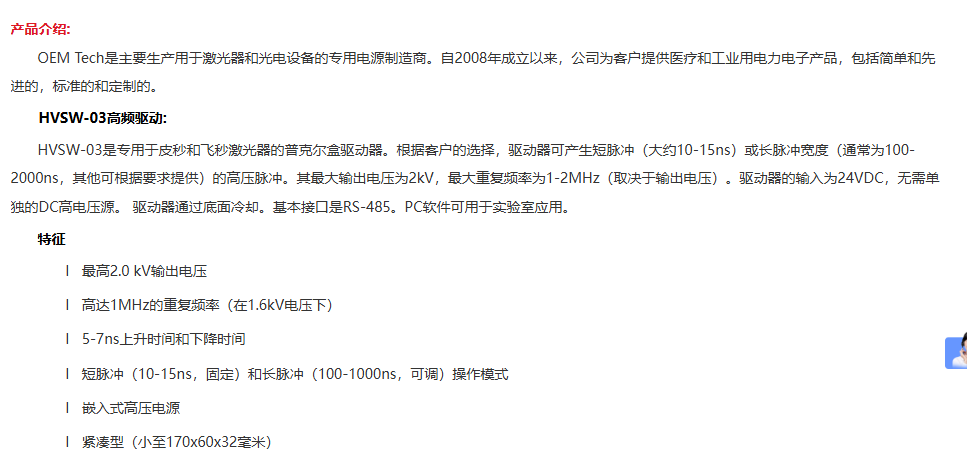 OEM-Tech 高频普克尔盒驱动 电话:0755-84670052 0755-83317701 手机/微信:13682357549 13246646513 QQ:672776553 564600083 1903656788 Email:672776553@qq.com 564600083@qq.com