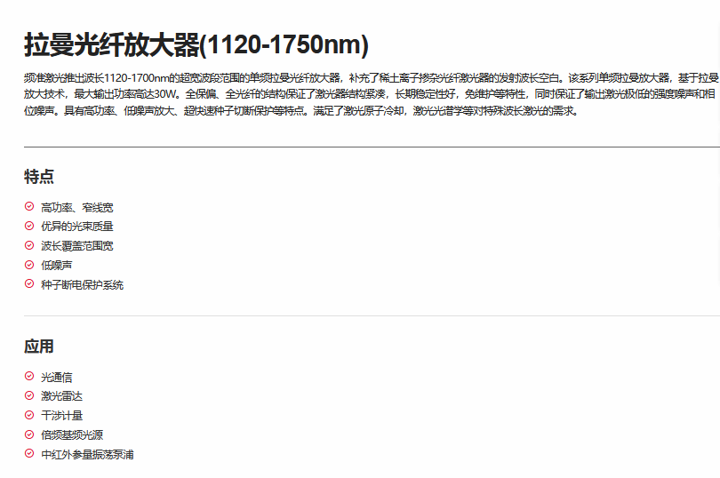 Precilasers频准激光 拉曼光纤放大器(1120-1750nm) 电话:0755-84670052 0755-83317701 手机/微信:13682357549 13246646513 QQ:672776553 564600083 1903656788 Email:672776553@qq.com 564600083@qq.com