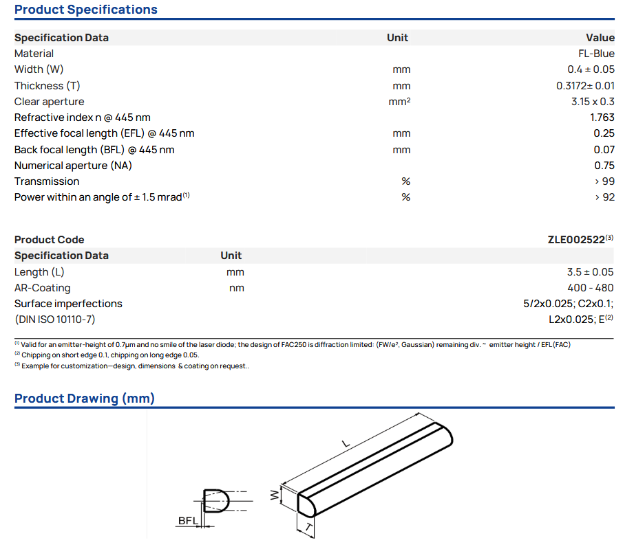 Blue FAC 250 (BFL=70µm) 快轴准直镜