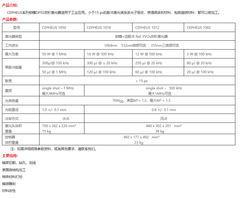 PHOTON ENERGY CEPHEUS 1002 皮秒激光器 手机/微信:13682357549 13246646513 QQ:672776553 564600083 1903656788 Email:672776553@qq.com 564600083@qq.com
