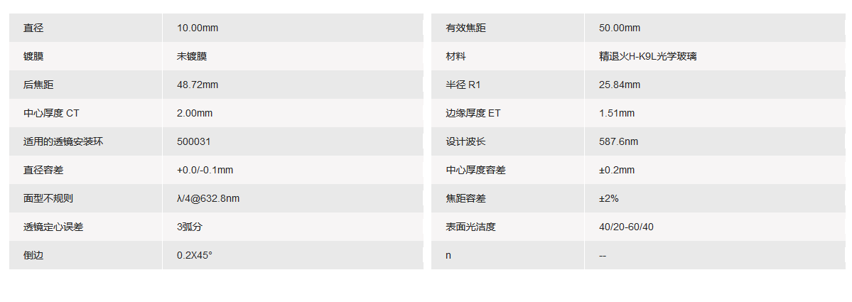 GRAND UNIFIED联合光科 D=10.00mm F=50.00mm K9平凸透镜