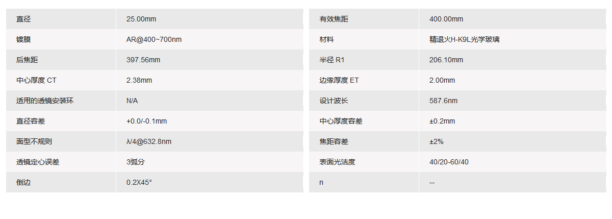 GRAND UNIFIED联合光科 D=25.00mm F=400.00mm VIS K9平凸透镜