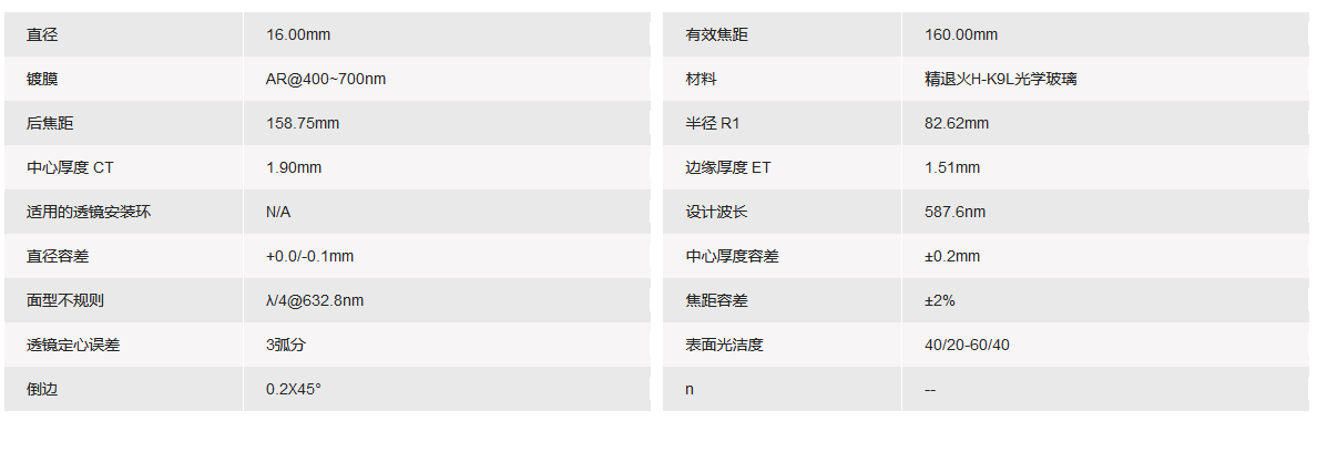 GRAND UNIFIED联合光科 D=16.00mm F=160.00mm VIS K9平凸透镜