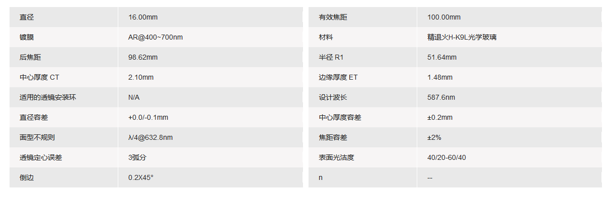 GRAND UNIFIED联合光科 D=16.00mm F=100.00mm VIS K9平凸透镜 手机/微信:13682357549 13246646513 QQ:672776553 564600083 1903656788 Email:672776553@qq.com 564600083@qq.com