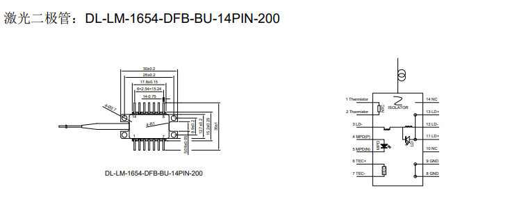 DIMENSION维度 DL-LM-1654-DFB-BU-14PIN-200 DFB激光二极管