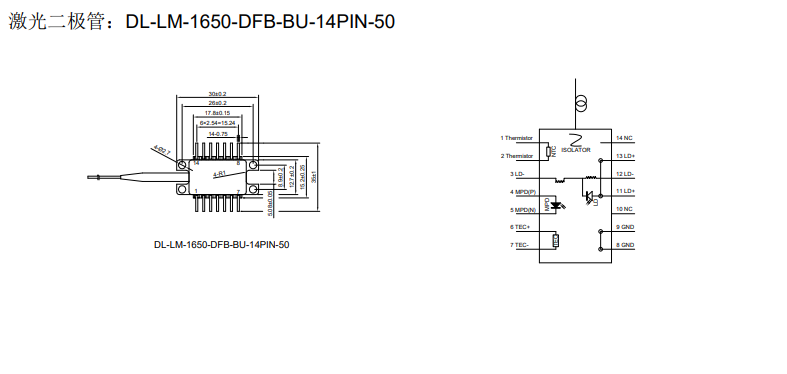 DIMENSION维度 DL-LM-1650-DFB-BU-14PIN-50 DFB激光二极管 手机/微信:13682357549 13246646513 QQ:672776553 564600083 1903656788 Email:672776553@qq.com 564600083@qq.com