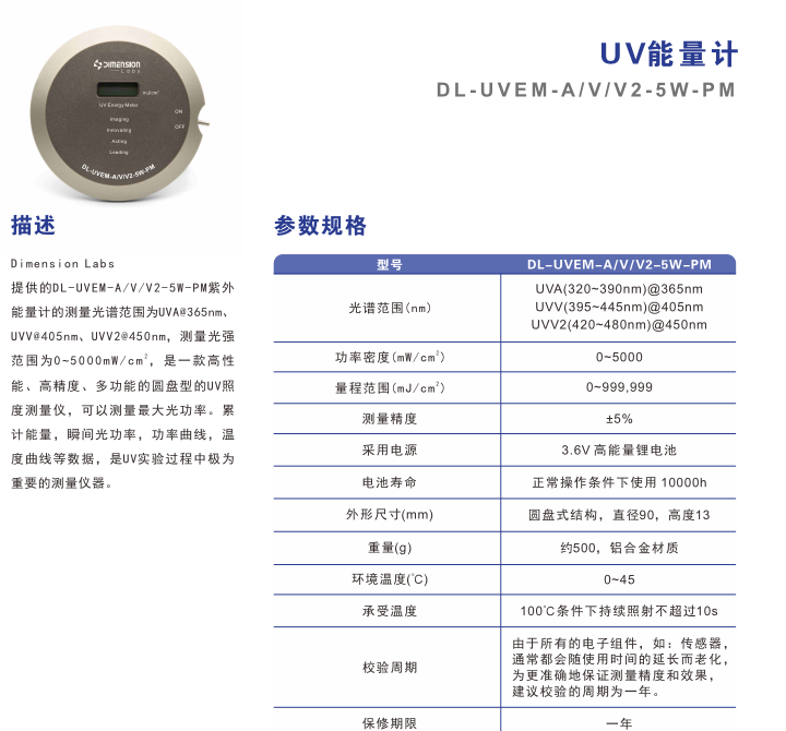 DIMENSION维度 DL-UVEM-A-V-V2-5W-PM UV能量计
