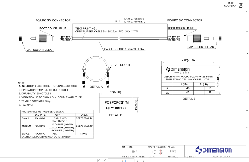 DIMENSION维度 DL-SMPC-488-H46-1-L3-SA 单模光纤跳线