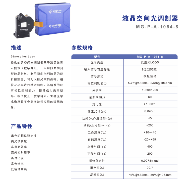 DIMENSION维度 MG-P-A-1064-8 液晶空间光调制器 手机/微信:13682357549 13246646513 QQ:672776553 564600083 1903656788 Email:672776553@qq.com 564600083@qq.com